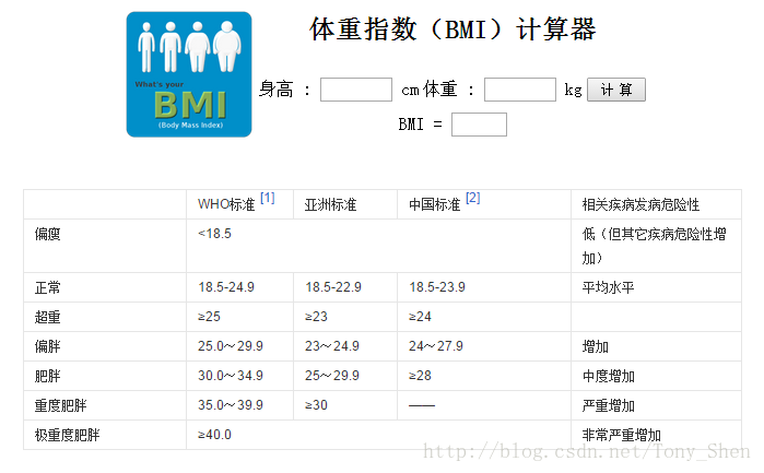 <td align="center" colspan="3"><h2>体重指数(BMI)计算器</h2></td></tr>